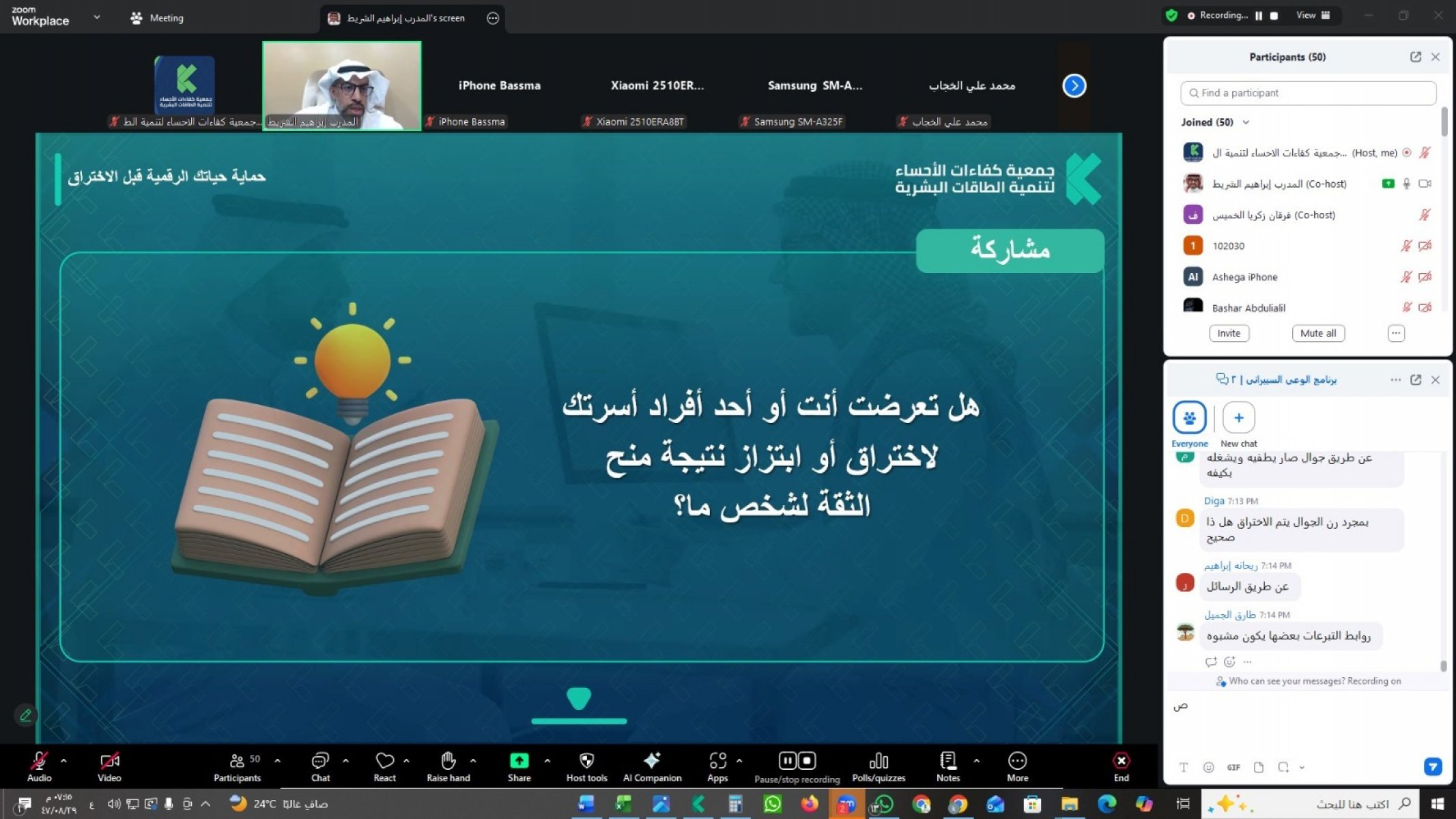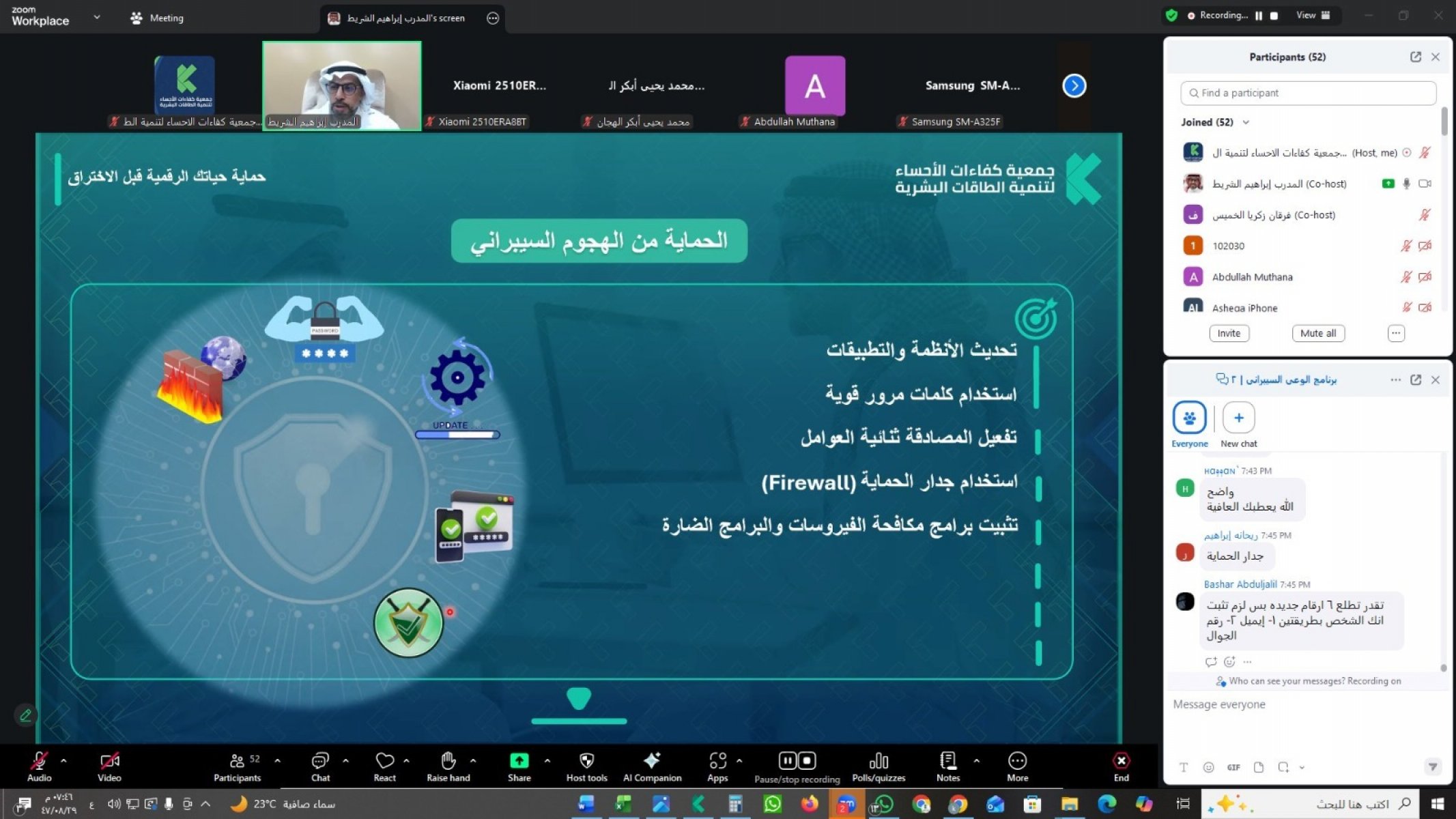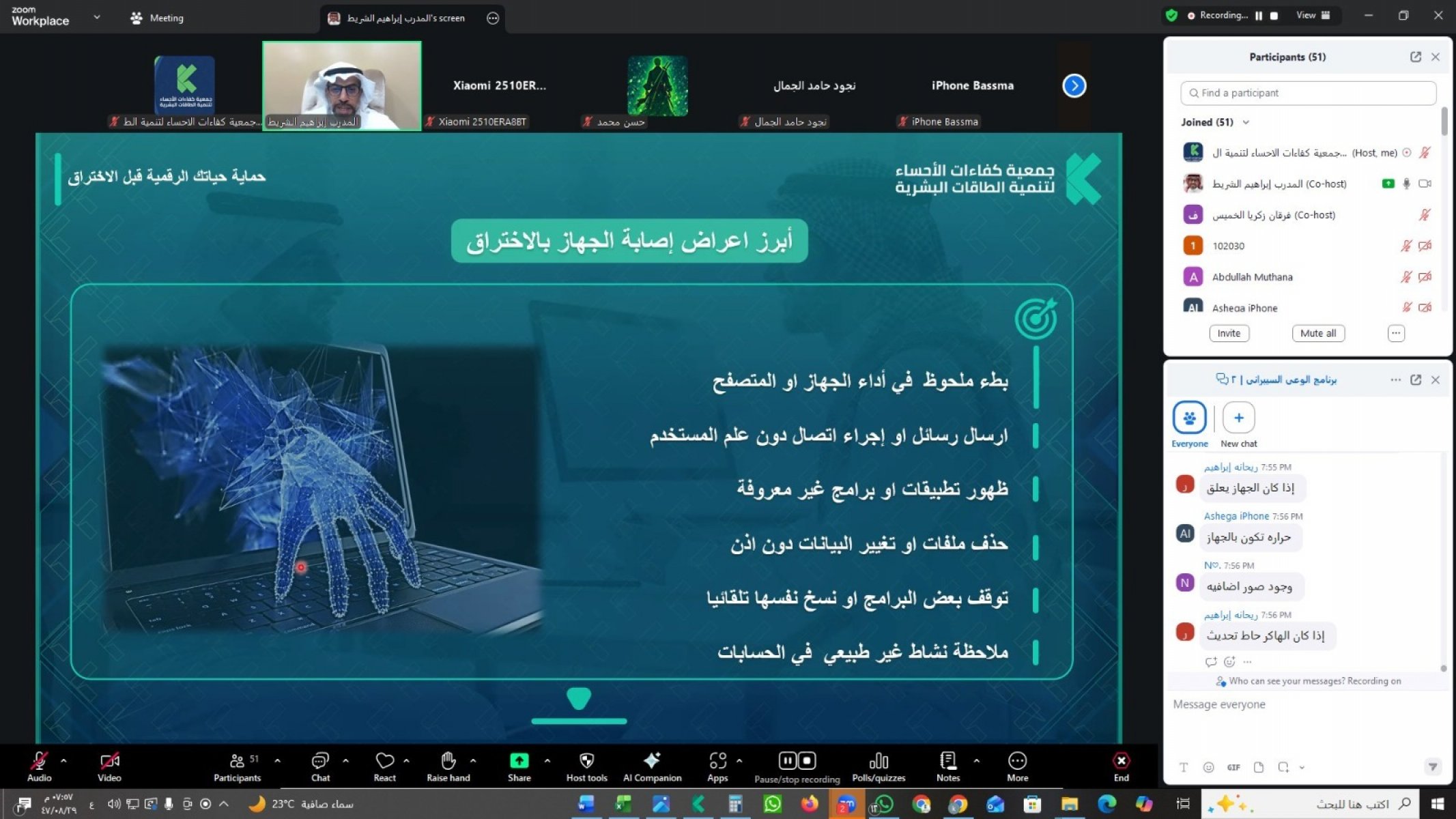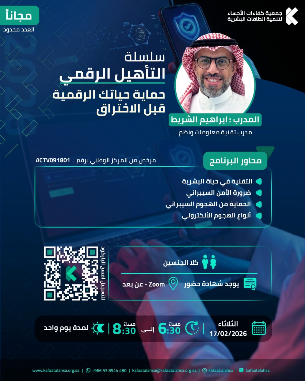 في إطار سعيها لتعزيز الوعي الرقمي وتمكين أفراد المجتمع من حماية بياناتهم ومعلوماتهم الشخصية، نفذت جمعية كفاءات الأحساء لتنمية الطاقات البشرية ضمن سلسلة التأهيل الرقمي برنامجًا تدريبيًا بعنوان حماية حياتك الرقمية قبل الاختراق، وذلك مساء يوم الثلاثاء الموافق 17 فبراير 2026م عبر منصة Zoom.